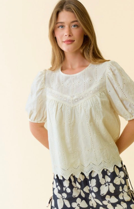 Ivory eyelet puff sleeve top